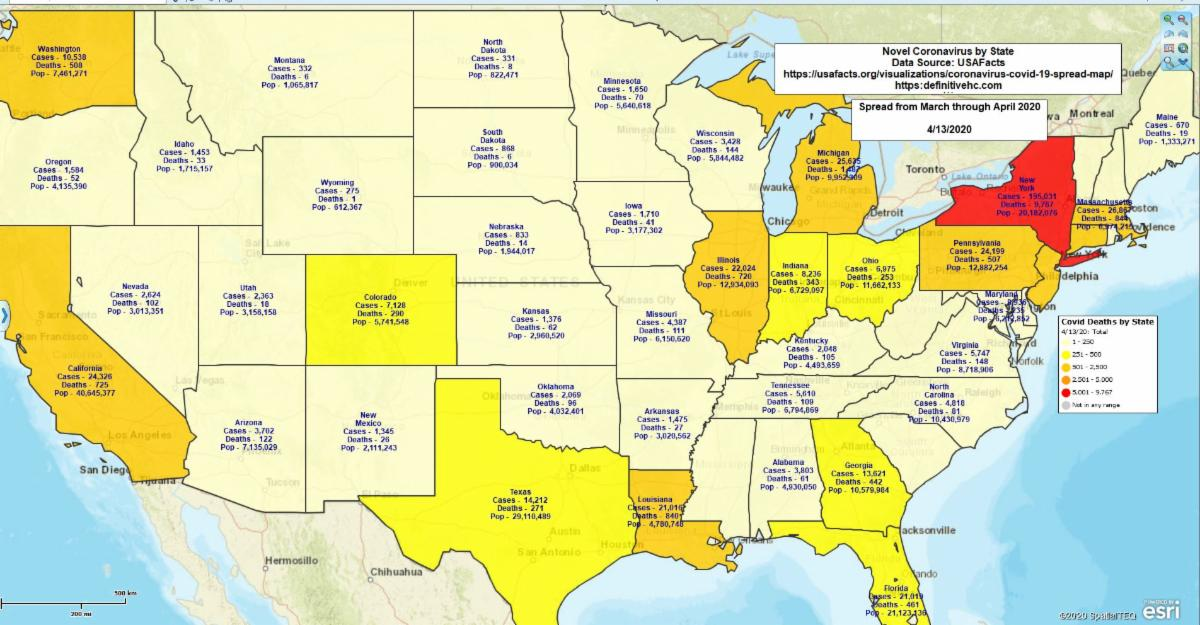 We've been publishing a blog link to our time-lapse map visualizing the COVID-19 USA contagion spread through March and April. This COVID-19 Map Gallery Link also describes the spread of the virus and is being updated daily (there have been a few interruptions due to lack of source data).