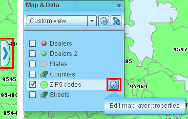• Inside Map & Data window move mouse pointer over map layer that you wish to change and click gear icon that will appear.