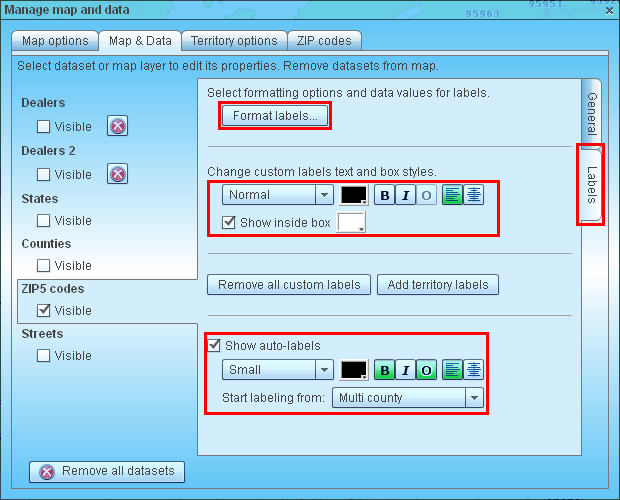 1. In ‘Manage map and data’ dialog select Labels tab. On the Labels tab you can edit custom label’s text size, style, color and alignment. Choose to show label in a box and box color.