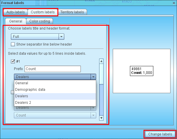 • You can show up to 5 lines of additional information inside label. Check a box with ‘#’ label and select data variable to show. You can choose any data column from datasets, which you plotted on map, or any variable from Census demographic data provided with MapBusinessOnline. Edit label line’s prefix if necessary.