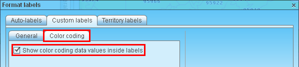 • In custom labels there is also the option to show values of data columns used in color-coding. See this article on how to Color code map or territories.
