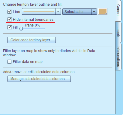 - ‘Manage map and data’ dialog with territory layer options will pop up. Here you can see ‘Hide internal boundaries’ option. Just change it as desired and your map will be updated.