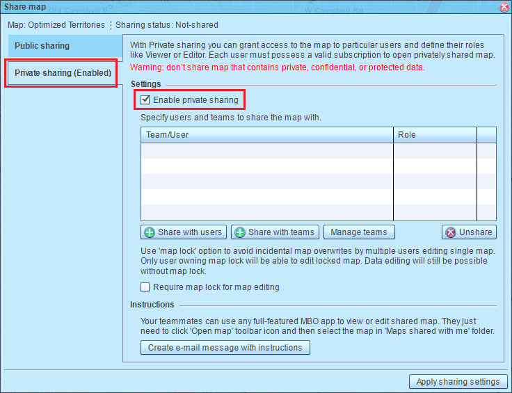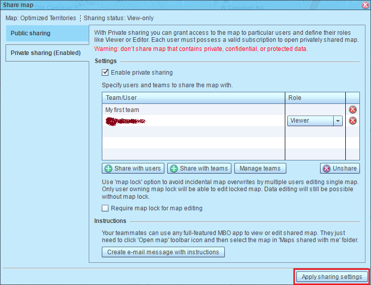 On another hand a map shared privately can be opened in fully functional Web App or Windows/macOS App and facilitates advanced collaboration such map editing by a team. To view or edit a privately shared map, one needs a subscription with MapBusinessOnline.